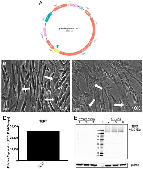 Both primary human SCs and hT-SerCs generally assumed a large, fibroblastic morphology with tripartite nucleoli [41] (Figure 1B,C). RT-qPCR analysis of human TERT expression in hT-SerCs indicated a fold change in expression relative to primary human SCs of over 25,800 (Figure 1D). Similarly, microarray analysis showed an approximately 10,000-fold increase in expression (Figure S1), indicating successful transduction and expression of hTERT in these cells. Western blot analysis confirmed that the protein expression of human TERT in hT-SerCs was greatly increased compared to the primary human SCs (Figure 1E). Light bands at 120 kDa were noted in the primary human SC protein samples and were attributed to normal, residual TERT expression as observed in other normal, somatic cells.