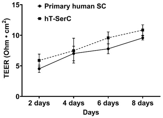 Transepithelial electrical resistance of primary human SCs at passages 4–6 and post-passage 20 hT-SerCs plated on 24-well Transwell inserts (0.4 μm pore size, 0.33 cm2 surface area) coated with 100 μL of 6.6 μg/mL (2 μg/cm2) human fibronectin. Resistance values were measured every two days for eight days and net resistance values for each insert were calculated by subtracting from cell-free coated inserts. TEER was calculated by multiplying the normalized resistance measurements with the surface area of the insert. Data are represented as the mean ± S.D. of three independent experiments.