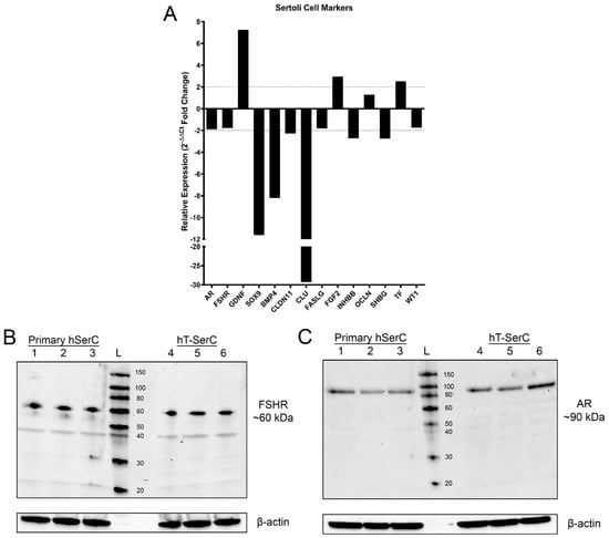 (A) Relative mRNA expression of various human SC marker genes assessed by RT-qPCR using the 2−ΔΔCt method. Ct values were normalized to GAPDH as the reference gene. (B) Representative Western blot of three independent experiments for the expression of human FSHR in primary human SCs at passages 4–6 (lanes 1–3) and post-passage 20 hT-SerCs (lanes 4–6). (C) Representative Western blot of three independent experiments for the expression of human AR in primary human SCs at passages 4–6 (lanes 1–3) and post-passage 20 hT-SerCs (lanes 4–6). The molecular weight ladder is denoted as L. Beta-actin served as the loading control.