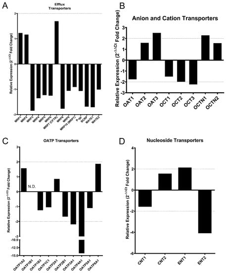 (A) Relative mRNA expression of various human xenobiotic efflux transporter genes assessed by RT-qPCR. (B) Relative mRNA expression of human anion and cation transporter genes in the SLC22A family. (C) Relative mRNA expression of human organic anion transporting polypeptide transporter genes in the SLC21 family. OATP1B1 expression was not detected in either cell type and denoted as N.D. (D) Relative mRNA expression of human concentrative and equilibrative nucleoside transporters. All fold-change values were calculated using the 2−ΔΔCt method. Ct values were normalized to GAPDH as the reference gene.