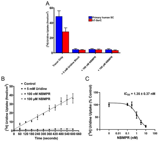 The expression of the ENTs in SCs has been well described and provides a route for endogenous nucleosides and nucleoside analog drugs to cross the BTB [13,14]. To validate the presence and function of the ENTs in hT-SerCs, the cellular uptake of a model substrate, uridine [13,14,22,38,53,54,55,56], was measured by transport assays. Total accumulation of ~25 nM [3H] uridine into primary human SCs at passages 4–7 and post-passage 20 hT-SerCs after 10 min was measured in the presence and absence of unlabeled uridine or two concentrations of NBMPR. NBMPR is a selective ENT1 inhibitor that effectively blocks all ENT1 activity at 100 nM; however, it also blocks all ENT2 activity at a higher concentration of 100 μM. Approximately 85–90% of [3H] uridine uptake in the primary human SCs and hT-SerCs was reduced in the presence of unlabeled uridine or both concentrations of NBMPR (Figure 5A). The total accumulation of [3H] uridine in primary human SCs after 10 min was approximately ~50 fmol/cm2 (Figure 5A) Interestingly, the maximum uptake of [3H] uridine was ~30–40% lower in hT-SerCs (~30 fmol/cm2); however, unlabeled uridine and NBMPR continued to block uptake to the same extent. These data suggest that uridine uptake into both cells is primarily mediated by ENT1 with minimal contribution by ENT2.