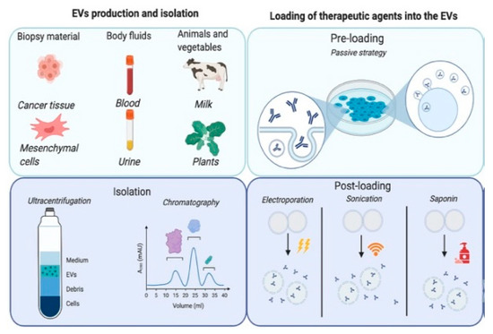 Conceptual overview of the different phases of EV-based therapy. EVs are produced and can be isolated from a wide range of cell types. EVs could be isolated from tissue biopsies, body fluids, as well as from animal and plant materials. To be used as a DDS, EVs can be isolated, for example, by ultracentrifugation or chromatography, depending on the type of EV and the source. In the second stage, the therapeutic agent will be loaded into the EVs. With pre-loading methods, the agent will be encapsulated into the EV in a natural way (i.e., using the machinery of the cell of origin). Post-loading approaches consist of physical or chemical methods, in which a disruption of the cell membrane of the already purified EV is induced. To improve the efficacy of the therapy, EVs can be modified, for instance, to increase the expression of certain receptors on the membrane, and this way its interaction with specific target cells or to avoid phagocytosis by the mononuclear phagocytic system. Finally, EVs are administered to the patients. The use of a proper route of administration may improve the pharmacokinetics of the drug by avoiding clearance or accumulation in off-target sites.