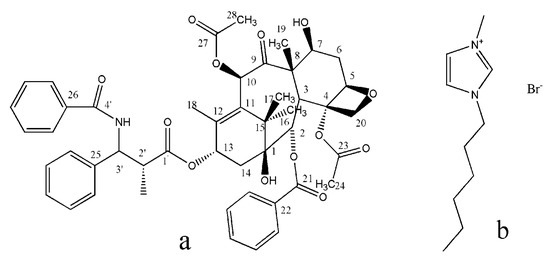 (a) Chemical structure of the paclitaxel. (b) Chemical structure of the HMImBr.