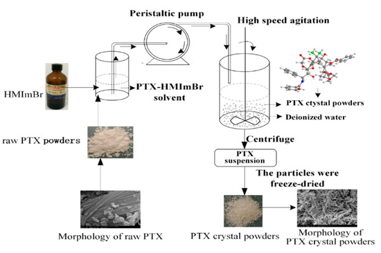 PTX crystal powders were prepared using the antisolvent precipitation technique. HMImBr was used as the solvent, and water was used as the antisolvent. PTX–HMImBr solution was then injected into a beaker with water, under stirring, at room temperature. The solid drug immediately precipitated upon mixing. After a certain time, the suspension was centrifuged until only a layer of precipitation was left. The suspension was then repeatedly washed with water for 8–10 times, through repeated centrifugation, and the particles were then freeze-dried. Every experiment was repeated at least thrice. The schematic diagram of the preparation of antisolvent process is shown in Figure 2.