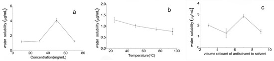 As shown in Figure 3a, the saturation solubility in water of the PTX crystal powders increased slowly under 30 mg/mL concentration and increased sharply in the range of 30–50 mg/mL concentration. However, when the concentration reached 50 mg/mL, the saturation solubility in water of PTX crystal powders decreased dramatically. Therefore, 50 mg/mL was considered as the optimal concentration of the PTX solution for the antisolvent precipitation process. As shown in Figure 3b, the saturation water solubility of the PTX crystal powders decreased with the increase of temperature. Thus, 25 °C was considered as the optimal temperature for the antisolvent precipitation process. Figure 3c indicates that the saturation solubility in water of PTX crystal powders initially decreased slowly and then increased sharply when the solvent-to-antisolvent volume ratio increased. However, when the solvent-to-antisolvent volume ratio was 1:7, the water saturation solubility of the PTX crystal powders decreased dramatically. Therefore, 1:7 was considered as the optimal solvent-to-antisolvent volume ratio for the antisolvent precipitation process.