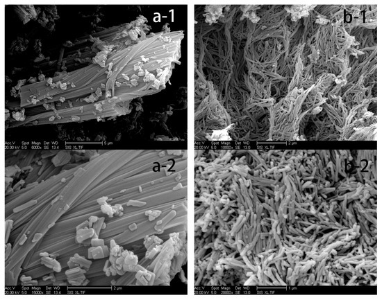 Scanning electron micrographs of each sample. (a-1) Raw PTX (magnification of 5000); (a-2) Raw PTX (magnification of 15,000); (b-1) PTX crystal powder (magnification of 10,000) and (b-2) PTX crystal powder (magnification of 20,000).