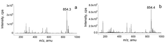 The chemical structures of the two PTX samples were further evaluated using HPLC–MS to determine their molecular weights. As shown in Figure 6, the molecular weights were not altered. Based on the calculation of the mass spectrum, the molecular weight of raw PTX and the PTX crystal powder was 854.3 and 854.4. Combining the FT–IR and HPLC–MS results, we could determine that the PTX chemical structure did not change during the antisolvent recrystallization process.