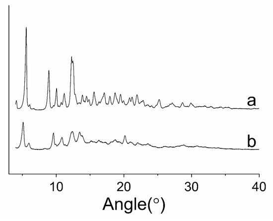 XRD patterns (2θ = 4–50°) of the samples. (a) Raw PTX; and (b) PTX crystal powders.