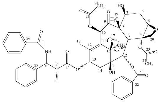 - Mastropaolo, D.; Camerman, A.; Luo, Y.; Brayer, G.D.; Camerman, N. Crystal and molecular structure of paclitaxel (taxol). Proc. Natl. Acad. Sci. USA 1995, 92, 6920–6924. [Google Scholar] [CrossRef]