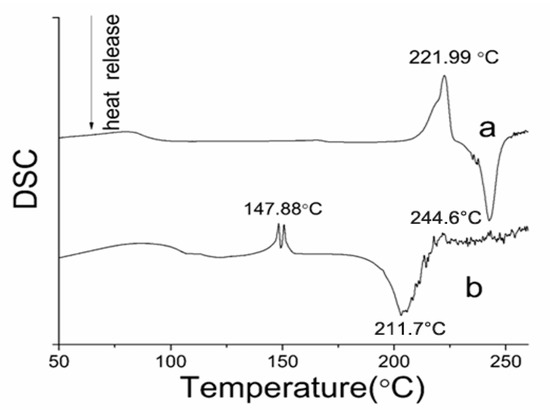 DSC curves (Temperature range: 50–3000 °C) of the samples. (a) Raw PTX, and (b) PTX crystal powders.