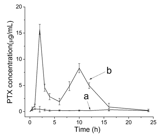 Chromatographic analyses were performed on a Waters HPLC system consisting of a pump (model 1525), an autosampler (model 717 plus), and a UV detector (2487 dual λ absorbance detector). The C18(2)column (Diamonsil, 5 μm, 4.6 mm × 250 mm, Dikma Technologies, Beijing, China) was used at 30 °C. Methanol, acetonitrile, and water (52.2:22.5:25) was used as the mobile phase. The flow rate was 1.0 mL/min, and the injection volume was 20 µL. The signal was monitored at 227 nm. The linear regression equations for the reference compound of PTX was Yptx = 3.6 × 104X − 24656 (r2 = 0.9998). A good linearity was found for PTX in the range of 0.3–300 µg/mL.