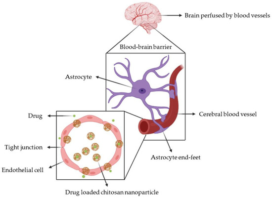 The cross-section of the cerebral blood vessel shows the interaction of drug loaded chitosan nanoparticles with the blood-brain barrier.