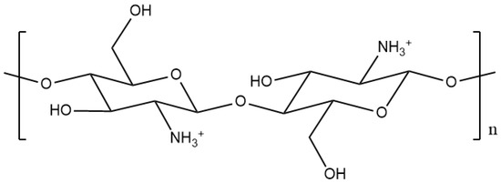 Chitosan is derived from partial N-deacetylation of chitin in hot alkaline media, resulting in a copolymer that consists of N-acetyl-glucosamine and N-glucosamine units linked by β-(1′4)-glycosidic bonds. Figure 2 shows its structure. The reaction conditions for its production determine the degree of deacetylation (DDA) and MW of chitosan [24]. The commercially available chitosan has a DDA that ranges between 70–85%. It is soluble in dilute acidic solutions, but insoluble at physiological pH. The polycationic amino groups confer upon chitosan the property of mucoadhesion, namely the establishment of ionic interactions with anions on the cell surface or mucous membrane, which increase the residence time at the target site, thereby enhancing membrane absorption [25].