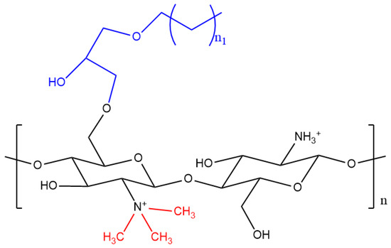 Structure of N,N,N trimethyl chitosan (methyl groups are shown in red) functionalised with an alkylglycerol (shown in blue) where “n1” represents either four, five, or eight alkyl chain.