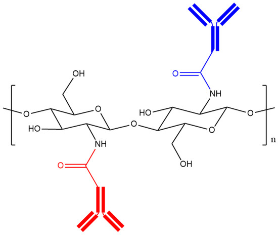 Structure of chitosan functionalised with hyaluronic acid (shown in red).