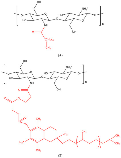 Structure of chitosan functionalised with (A) stearic acid (shown in red) and (B) d-α-tocopherol PEG 1000 succinate (shown in red).