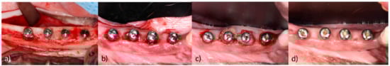 - Fickl, S.; Kebschull, M.; Calvo-Guirado, J.L.; Hurzeler, M.; Zuhr, O. Experimental peri-implantitis around different types of implants—A clinical and radiographic study in dogs. Clin. Implant Dent. Relat. Res. 2015, 17 (Suppl. 2), e661–e669. [Google Scholar] [CrossRef] [PubMed]