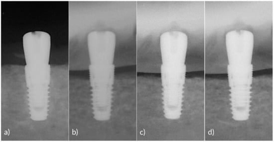 A set of peri-apical radiographs were taken at the surgery, T1, T2, and T3 to measure the marginal bone level changes over the treatment period (Figure 2a–d). All of the implants were placed on the alveolar bone crest level, therefore abutment-fixture junction (A/F) was taken as a reference line. The mean distance from A/F to marginal bone crest at mesial and distal sides of all implants were recorded using Image J (National Institutes of Health, Bethesda, MD, USA) [26].
