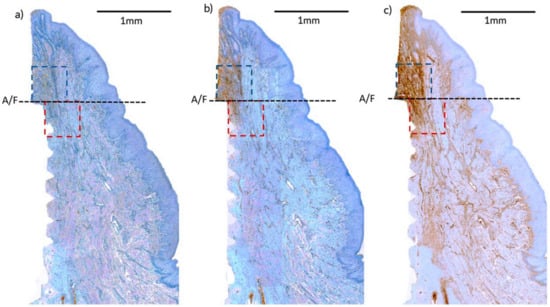 The digital images of the specimens were obtained (Panoramic 250 Flash III, 3D, Case Viewer 2.0, 3D Histech, Budapest, Hungary) and the intensities of positive cells were detected using the IHC profiler, Image J (National Institutes of Health, Bethesda, MD, USA) [29]. Areas of 0.5 × 0.5 mm above and below the A/F were analyzed (Figure 3).