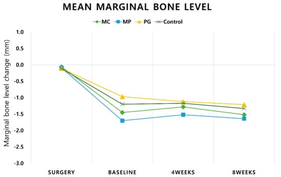 Mean marginal bone loss of −0.9 mm (PG) to −1.6 mm (MP) occurred after inducing peri-implantitis with a ligature (Figure 4, Appendix A Table A2). Minimal mean marginal bone gain occurred from MC (0.17 ± 0.28 mm) and MP (0.12 ± 0.29 mm) while PG (−0.15 ± 0.24 mm) presented negligible mean marginal bone loss after the first delivery. Minimal mean marginal bone level change was also observed after the second delivery ranging from −0.06 ± 0.29 mm (MP) to −0.024 ± 0.25 mm (MC). All results were comparable between the groups.