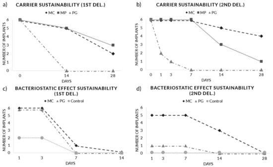 Carrier and bacteriostatic effect sustainability evaluation. (a) Carrier sustainability after the first administration, (b) carrier sustainability after the second administration, (c) bacteriostatic effect sustainability after the first administration, (d) bacteriostatic effect sustainability after the second administration.