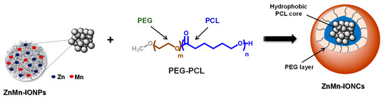 Scheme for nanocluster preparation. To prepare nanoclusters, iron oxide nanoparticles doped with Zn and Mn (ZnMn-IONPs) were encapsulated into the hydrophobic core of a PEG-PCL-based nanocarrier.