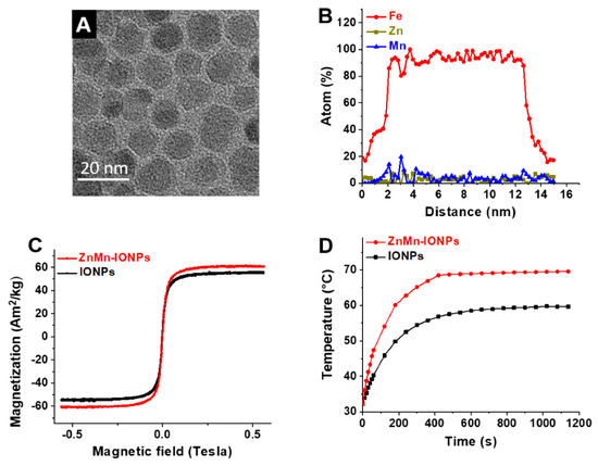 (A) Representative TEM image of Zn- and Mn-doped iron oxide nanoparticles (ZnMn-IONPs). (B) EDX line scanning profiles of one ZnMn-IONP. (C) Magnetization loops of ZnMn-IONPs (red) and IONPs (black) at 300 K. (D) Heating curves of ZnMn-IONPs and IONPs (1 mg of Fe/mL in THF) in the presence of an alternating magnetic field (AMF) (420 kHz, 26.9 kA/m).