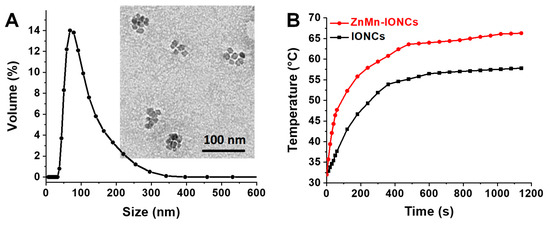 (A) Size distribution of ZnMn-IONCs tested by dynamic light scattering. Inset: representative TEM image of ZnMn-IONCs. (B) Heating curves of ZnMn-IONCs and IONCs (1 mg of Fe/mL in water) exposed to AMF (420 kHz, 26.9 kA/m).