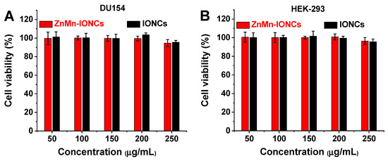 Viability of human prostate cancer DU145 cells (A) and human embryonic kidney HEK-293 cells (B) treated for 24 h with various concentrations of ZnMn-IONCs and IONCs (50–250 μg of Fe/mL).