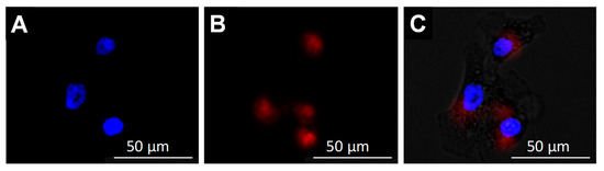 Fluorescence microscopy images of DU145 cells demonstrating intracellular localization of ZnMn-IONCs loaded with a near-infrared (NIR) dye, SiNc: (A) DAPI staining, (B) SiNc-ZnMn-IONCs and (C) overlay.