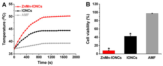 (A) Representative heating curves of DU145 cells treated with medium only (AMF), ZnMn-IONCs (50 μg of Fe/mL) and IONCs (50 μg of Fe/mL) for 24 h, and exposed to AMF (420 kHz, 26.9 kA/m). (B) The viability of DU145 cells treated with ZnMn-IONCs (50 μg of Fe/mL), IONCs (50 μg of Fe/mL) and medium (AMF) for 24 h and subjected to AMF for 30 min. * p < 0.05 when compared with untreated cells.