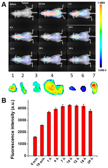 (A) NIR fluorescence images of a mouse with DU145 xenograft at different time points following intravenous administration of SiNc-loaded ZnMn-IONCs (top panel). Organs and tumor distribution of SiNc-loaded ZnMn-IONCs 18 h after intravenous injection (lower panel). 1—lungs; 2—spleen; 3—kidneys; 4—liver; 5—heart; 6—brain; 7—tumor. (B) The NIR fluorescence intensity was measured in the tumor as a function of time after intravenous injection of SiNc-ZnMn-IONCs in a mouse bearing a DU145 tumor.