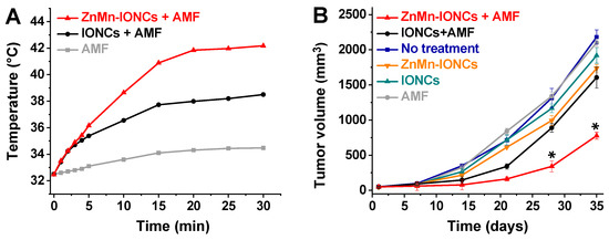 (A) Intratumoral temperature curves during AMF (420 kHz, 26.9 kA/m) exposure of animals treated with 5% dextrose (AMF), ZnMn-IONCs (10 mg of Fe/kg) and IONCs (10 mg of Fe/kg). (B) Tumor growth profiles after four cycles of the following treatments: (i) no treatment; (ii) ZnMn-IONCs + AMF, mice injected with ZnMn-IONCs (10 g of Fe/kg) and subjected to AMF for 30 min; (iii) IONCs + AMF, mice injected with IONCs (10 g of Fe/kg) and subjected to AMF for 30 min; (iv) ZnMn-IONCs, mice injected with ZnMn-IONCs (10 g of Fe/kg); (v) IONCs, mice injected with IONCs (10 g of Fe/kg); and (vi) AMF, mice injected with 5% dextrose and exposed to AMF. * p < 0.05 when compared with non-treated animals.