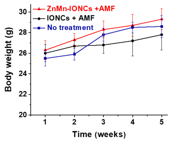 Changes in body weights of non-treated mice and animals exposed to 4 cycles of ZnMn-IONC- and IONC-mediated hyperthermia.