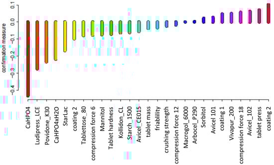 The results of the attribute relevance assessment for the generated sets of decision rules are presented in Figure 1. The higher the value of the confirmation measure of a conditional attribute, the greater its influence on the correct classification of objects using the generated rules. Attributes describing the composition (coating 2, coating 1, Avicel 101 and 102, Vivapur200) and the process (type of tablet press and compression force) have the greatest impact on the correct classification of objects.