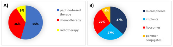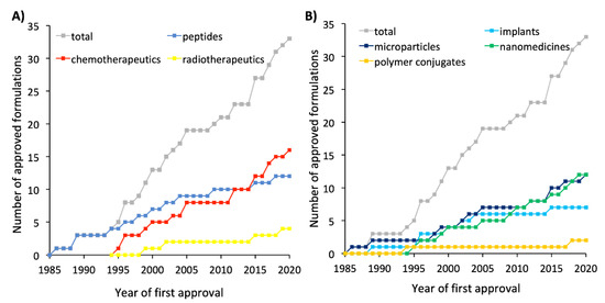 During this decade, 55% of all formulations that received authorization were peptides, which were formulated mainly within microspheres and implants. Thirty-six percent (36%) were chemotherapeutic agents formulated mainly in liposomes (Figure 1).