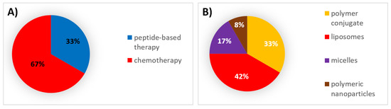 Of all the cancers treated with chemotherapeutic agents, the most common indication is hepatocellular carcinoma (37.5%), which accounts for >80% of primary liver cancers worldwide [176], followed by breast cancer (19%), mostly as second-line and hematological malignancies (19%). Of the nonmarketed formulations for the delivery of chemotherapeutics that are currently being evaluated in clinical trials, breast cancer represents the most frequent indication (50%), followed by adenocarcinoma of the pancreas (37.5%). However, as it also occurred with peptide-based therapy, future trends should be analyzed with caution, given that six of these phase III trials with chemotherapeutic formulations had a negative outcome