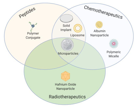 The mechanism of action differs depending on the type of therapy. Peptides aim to interfere with biological processes to stop or slow down the growth of cancer and possess many advantages, such as high specificity, low toxicity, and good biocompatibility [5,6]. The best classical example of the application of peptides in cancer treatment is the use of gonadotropin-releasing hormone (GnRH) agonists. The prolonged activation of GnRH receptors by GnRH agonists leads to desensitization through receptor downregulation to reduce the secretion of gonadotropin hormones, which results in inhibition of the growth of certain hormone-dependent tumors [7]. The main drawbacks of peptides are the extremely low half-life and the low bioavailability once administered. Therefore, in order to maintain an effective therapeutic plasma concentration, the frequency of doses needs to be increased, which inevitably leads to poor patient compliance, potential side effects, and an increase in the cost of therapy [8,9].