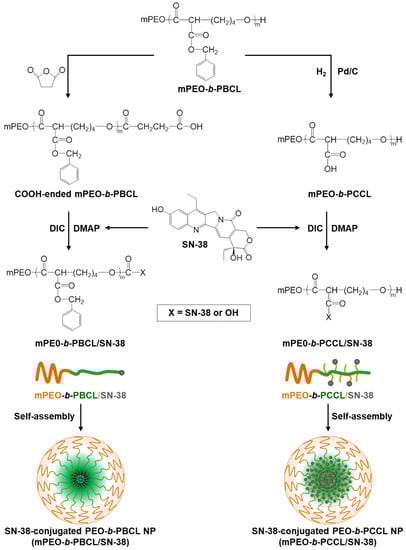 Chemical structures of SN-38, mPEO-b-PBCL, mPEO-b-PCCL, and schematic procedures to synthesize mPEO-b-PBCL/SN-38 and mPEO-b-PCCL/SN-38, forming self-assembled micelles.