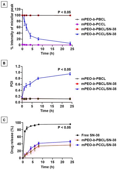 Average (A) percentage of intensity and (B) polydispersity index (PDI) of mPEO-b-PBCL, mPEO-b-PBCL/SN-38, mPEO-b-PCCL (no PDI data), and mPEO-b-PCCL/SN-38 micellar peak (3 mg·mL−1) in the presence of SDS (20 mg·mL−1) at a ratio of 2:1 (v/v) as a function of time up to 24 h. Each point represents mean ± SD (n = 3). (C) The drug release profile of mPEO-b-PBCL/SN-38 and mPEO-b-PCCL/SN-38 micelles compared to free SN-38 from dialysis tubing (MWCO = 3.5 kDa) in aqueous solution (4% albumin in ultrapure water) at 37 °C. Data are represented as mean ± SD (n = 3). The results of statistical analysis using one-way ANOVA followed by Tukey’s method showed a significant difference between PEO-b-PBCL and mPEO-b-PCCL, between mPEO-b-PBCL/SN-38 and mPEO-b-PCCL/SN-38 in Figure 4A, between mPEO-b-PCCL/SN-38 and PEO-b-PBCL, between mPEO-b-PCCL/SN-38 and mPEO-b-PBCL/SN-38 in Figure 4B, and between free SN-38 and mPEO-b-PBCL/SN-38, between free SN-38 and mPEO-b-PCCL/SN-38 in Figure 4C. Significances of the differences were considered if p ≤ 0.05. Data are expressed as mean ± SD (n = 3).