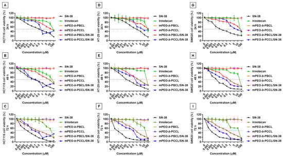 In vitro cytotoxicity assay for free SN-38 (black), irinotecan (green), mPEO-b-PBCL (orange), mPEO-b-PCCL (purple), mPEO-b-PBCL/SN-38 (red), and mPEO-b-PCCL/SN-38 (blue) in (A–C) HCT116, (D–F) HT-29, and (G–I) SW620 cell lines after 24 h, 48 h, and 72 h incubation at 37 °C in 5% CO2. The cells were treated with free drug and polymeric micelles with a range of concentrations from 0.001 µM to 100 µM. SN-38 was solubilized with DMSO and the untreated cells received only 0.1% DMSO. Each point represents mean ± SD (n = 4).