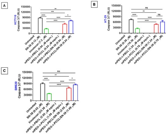 Caspase activity assay for free SN-38, irinotecan, mPEO-b-PBCL, mPEO-b-PCCL, mPEO-b-PBCL/SN-38, and mPEO-b-PCCL/SN-38 in (A) HCT116, (B) HT-29, and (C) SW620 cell lines. The cells were treated with the media containing the respective IC50 (24 h) concentrations of free SN-38, irinotecan, mPEO-b-PBCL/SN-38, and mPEO-b-PCCL/SN-38 for 6 h. Treated amounts of mPEO-b-PBCL and mPEO-b-PCCL were equivalent to the amounts of mPEO-b-PBCL/SN-38 and mPEO-b-PCCL/SN-38, respectively. The untreated (control) cells received only 0.1% DMSO. The significances of the differences are indicated as * p ≤ 0.05, ** p ≤ 0.01, *** p ≤ 0.001, and **** p ≤ 0.0001 following a two-way ANOVA multiple comparison test, which was followed by Tukey’s method. Data are expressed as mean ± SD (n = 6). ns: no significance.