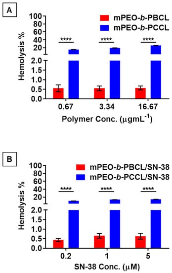 As shown in Figure 7A, 30 min exposure to mPEO-b-PBCL did not exhibit any hemolytic activity at a polymer concentration as high as 16.67 µg·mL−1, which was the polymer concentration equivalent to the highest concentration of SN-38 (five times higher than its IC50). Similarly in Figure 7B, mPEO-b-PBCL/SN-38 showed no hemolytic activity at a concentration of 5 µM that was five times higher than its IC50 (1 µM after 24 h of treatment). However, mPEO-b-PCCL showed 15.32 ± 0.18%, 19.42 ± 0.34%, and 25.63 ± 0.13% hemolysis at 0.67 µg·mL−1, 3.34 µg·mL−1, and 16.67 µg·mL−1 concentrations, respectively, which was significantly (p ≤ 0.0001) higher than the hemolytic activities caused by mPEO-b-PBCL at similar levels (Figure 7A). The measured percentages of hemolytic activity of mPEO-b-PCCL/SN-38 micelles were 10.19 ± 0.15, 13.45 ± 0.14, and 14.46 ± 0.15 at polymer concentrations of 0.67 µg·mL−1, 3.34 µg·mL−1, and 16.67 µg·mL−1, respectively, which was significantly (p ≤ 0.05) reduced when compared to that of mPEO-b-PCCL micelles after SN-38 conjugation (Figure 7B). The overall results suggest that mPEO-b-PBCL and its SN-38 conjugated form are unlikely to affect red blood cells [31]. In contrast, mPEO-b-PCCL and its SN-38 conjugated form can cause hemolysis despite a reduction in the hemolytic activity of the polymer upon SN-38 conjugation.