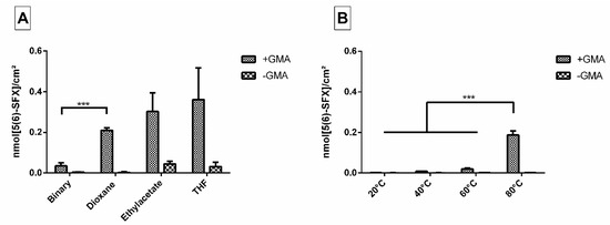 (A) Immobilized 5(6)-SFX indicating the amount of accessible, derivatizable amino groups introduced to the film surface via ED900 linker addition after cross-copolymerization with and without GMA using different solvents. Binary solvent mixture consisted of acetone and DCM (5:3). (B) 5(6)-SFX bound to film surfaces with and without GMA after incubation at different temperatures. The applied cross-copolymerization solvent is dioxane, short incubation periods (2 h) at 80 °C were compared to longer incubation (15 h) at 20, 40, and 60 °C. All values represent the mean ± SD of n ≥ 4. *** p < 0.001 vs. respective treatment.