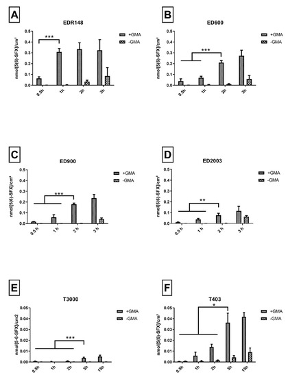 Immobilized 5(6)-SFX indicating the amount of accessible, derivatizable amino groups on the film surface. Values measured on the film surface after cross-copolymerization with and without GMA and subsequent incubation with different linker molecules over varying periods. (A–D) represent the results for two-armed, (E,F) for three-armed polyetheramine-based linker molecules applied. All values represent the mean ± SD of n ≥ 4. * p < 0.05; ** p < 0.01; *** p < 0.001 denotes significant difference vs. the respective treatment.