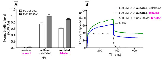 Surface plasmon resonance analysis of sclerostin/GAG interaction, reported as resonance units (RU). (A) Relative binding levels of labeled and unlabeled sulfated or native hyaluronan and corresponding sensorgrams (B). GAGs were injected at 50 and 500 µM related to the molecular weight of their disaccharide units (D.U.).