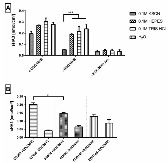 Quantitative comparison of the sHA3 functionalization of EDR148, ED600, and ED900 linker decorated materials, however, revealed decisive differences. The low efficiency of covalent sHA3 surface decoration on the EDR148 modified materials leads to the conclusion, that this linker, regardless of its reactivity, is too short to allow a sufficient covalent binding of the relatively large sHA3 and thereby functionalization. In addition, we found particular strong adsorptive interaction between the densely linker decorated films and sHA3 that was not removable even with the thiocyanate buffer. These ionic interactions may have reduced the availability of sHA3 for covalent binding.