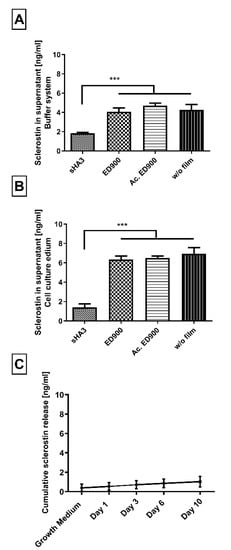 Sclerostin binding to variously decorated material films. (A–C) Differently modified surfaces were incubated with 8 ng/mL sclerostin. Binding was quantified by the amount of unbound sclerostin in the supernatant after 24 h (A,B). (C) Cumulative sclerostin release from a saturated and preincubated (40 ng/mL) sHA3 surface. Sclerostin was presented in either 0.1% BSA and 0.2% Tween 80 in PBS (A) or DMEM with 10% serum (B,C). Film surfaces: sHA3: covalent ED900 and sHA3-coating; ED900: ED900 modified film preincubated with soluble sHA3, Ac. ED900: Acetylated ED900 acetylated to neutralize positive charge; T134LA6: nonmodified film. All values represent the mean ± SD of n ≥ 4. *** p < 0.001 denotes significant difference vs. the respective surface modification.