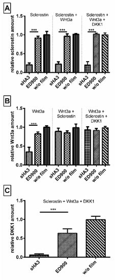 Sclerostin and DKK1 are the preferred binding partner of sHA3 functionalized films. Differently modified films were incubated with the same molar amounts of Sclerostin, Wnt3a, or both proteins combined. Unbound (A) Sclerostin, (B) Wnt3a, and (C) DKK1 was quantified after 24 h from the supernatant via ELISA. Recovery normalized to controls without any films (blank well plates). Film surfaces: ED900: ED900 incubated with soluble sHA3; sHA3: ED900 covalently coated with sHA3. All values represent the mean ± SD of n ≥ 4. *** p < 0.001 denotes significant difference vs. the respective surface modification.