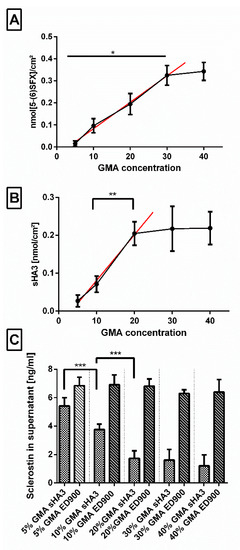 In order to find the most efficient material composition for effective scavenging, we varied the amount of GMA (5–40% m/m) in the film matrix and investigated decoration with linker (Figure 7A), sHA3 (Figure 7B), and sclerostin scavenging (Figure 7C).
